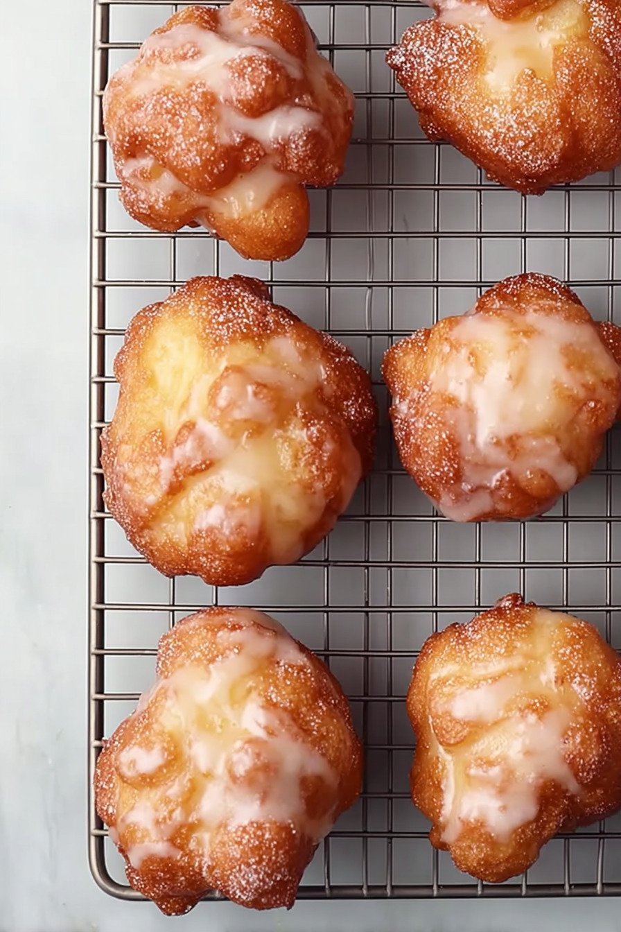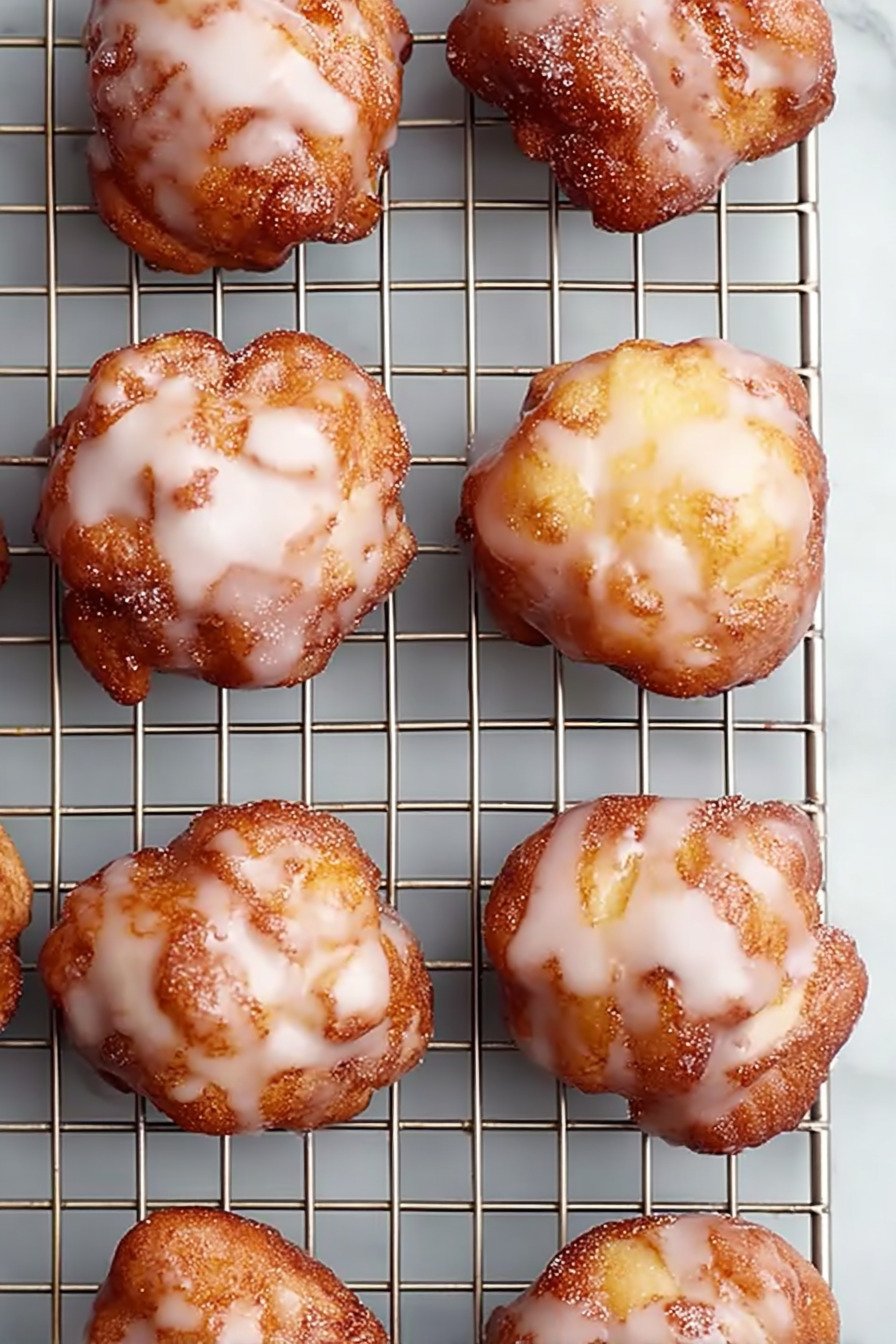 2. Dip warm fritters into the glaze and set back on the rack so extra drips away.