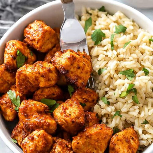 Rest and serve I let the chicken sit for two minutes. Then I plate with rice salad or warm flatbread. The bites vanish fast.