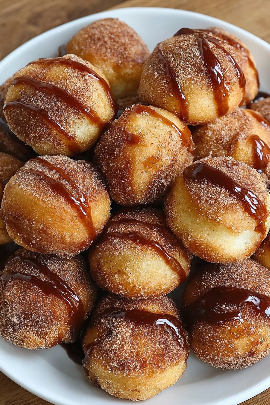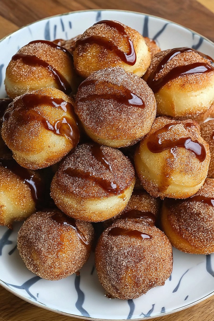 Roll the donut bites in cinnamon sugar right after cooking. The coating sticks best when the surface stays warm.