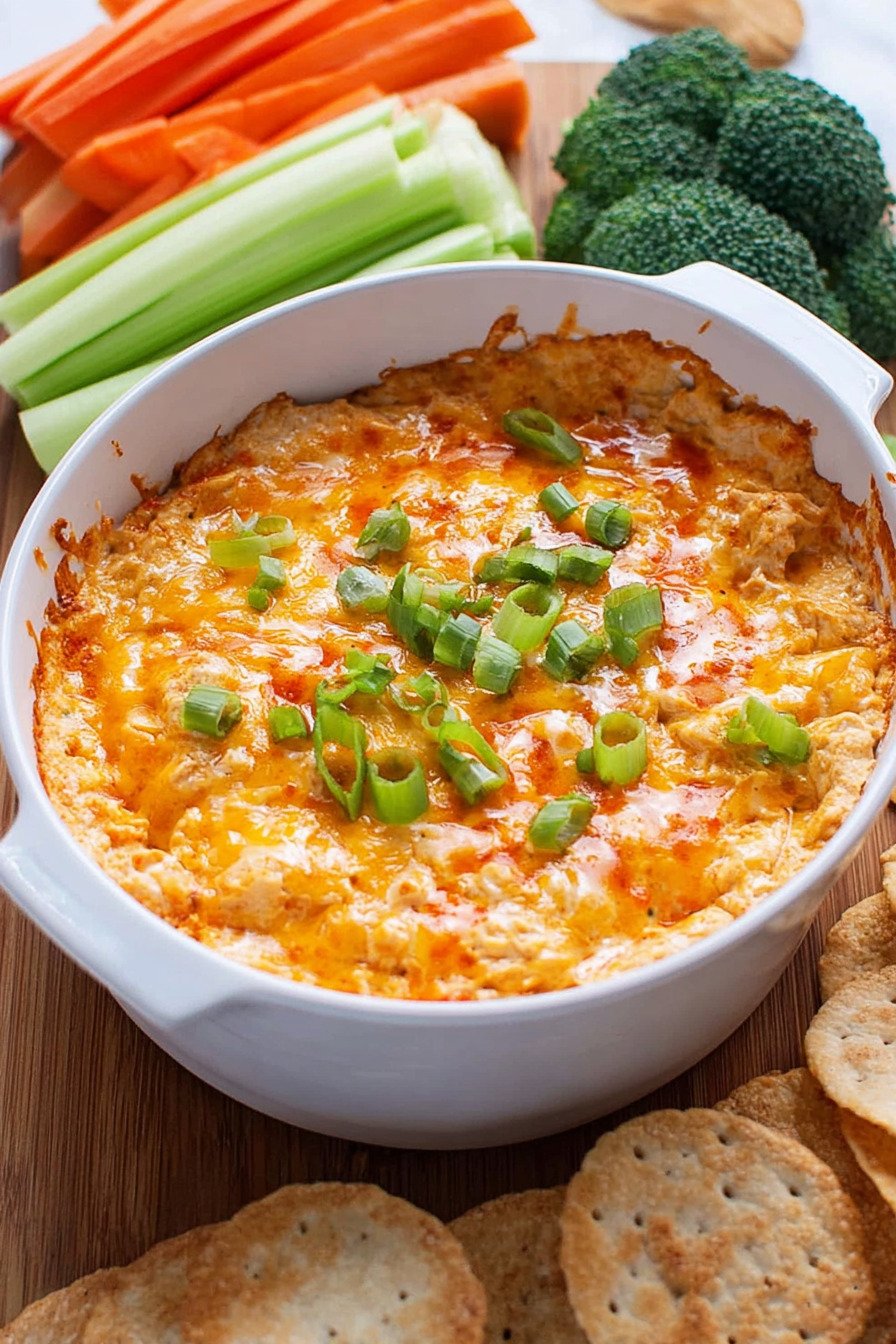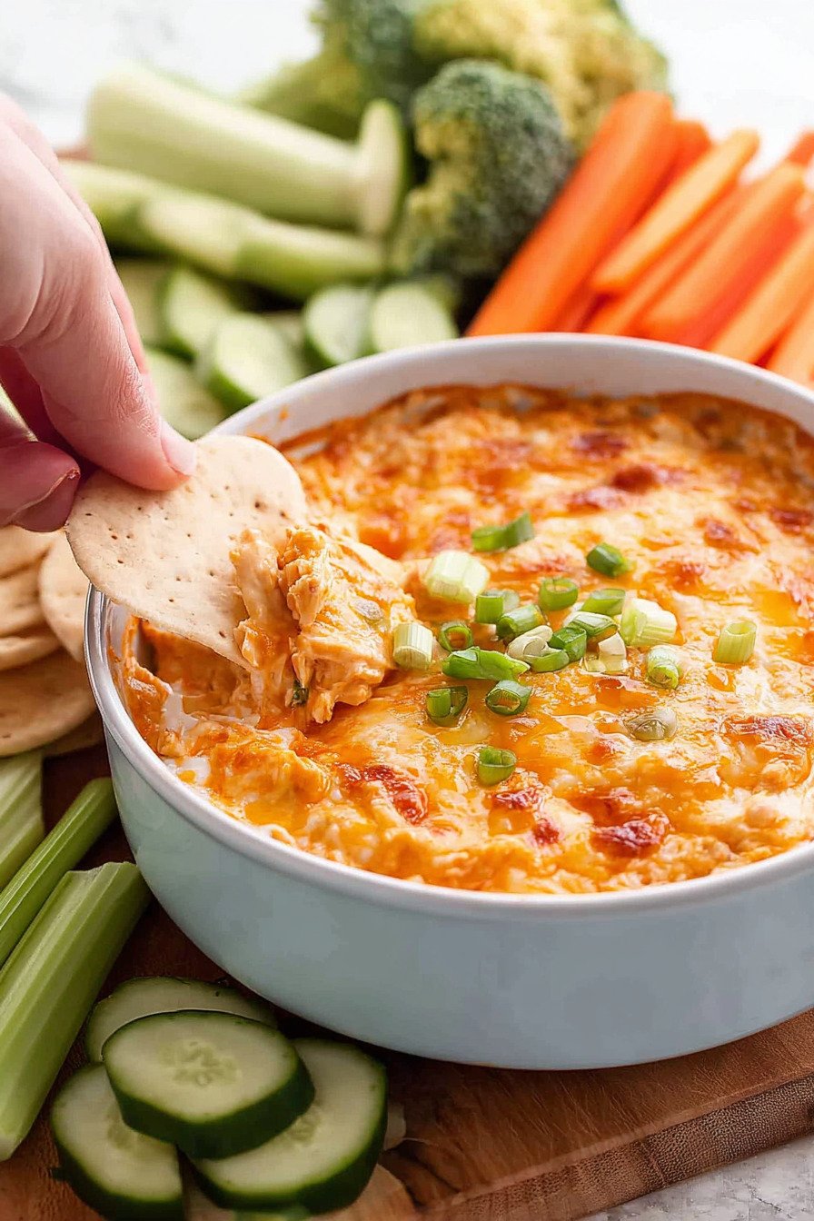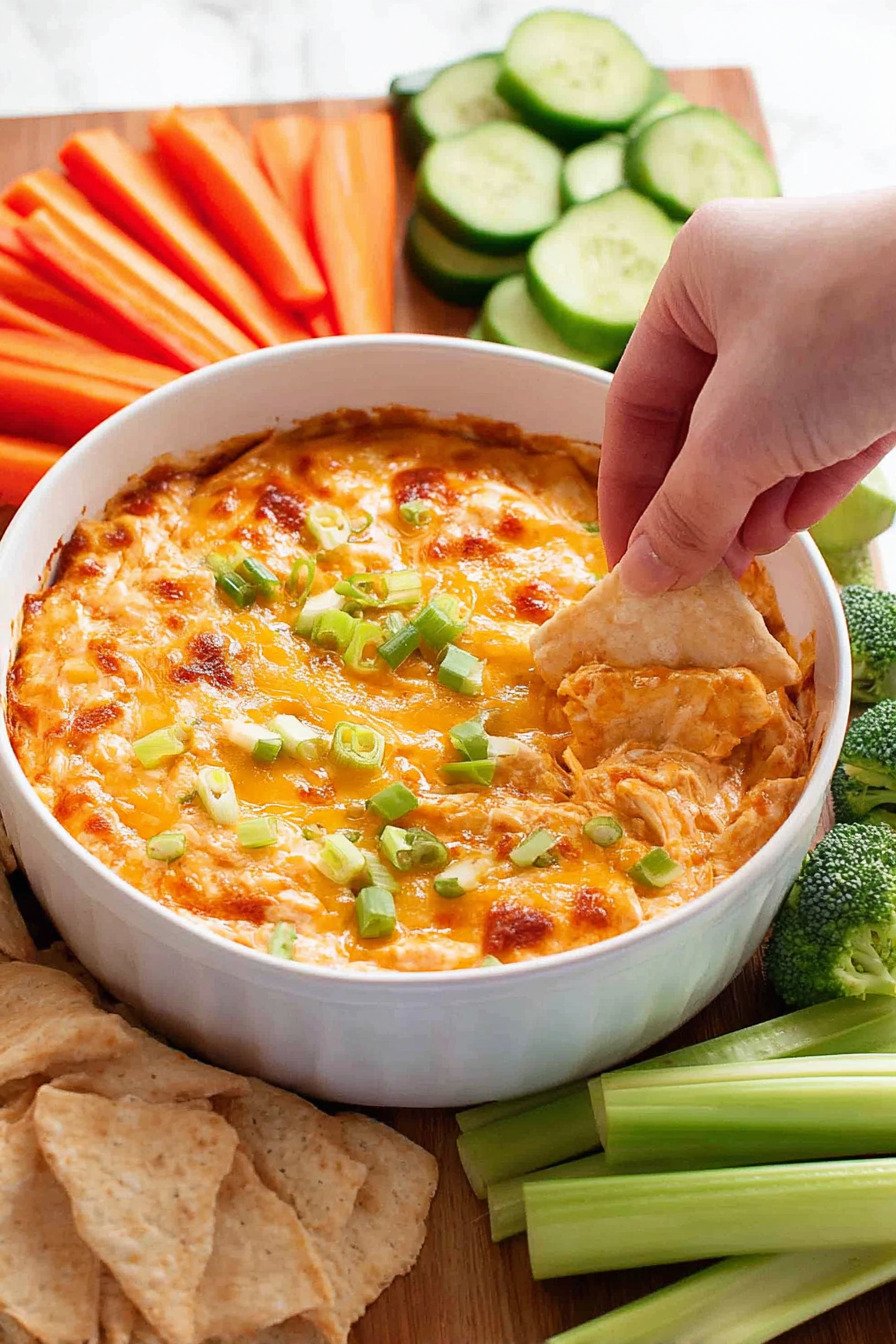 This dip offers protein from chicken and richness from cheese. Portion size matters. Pair it with fresh vegetables for balance.