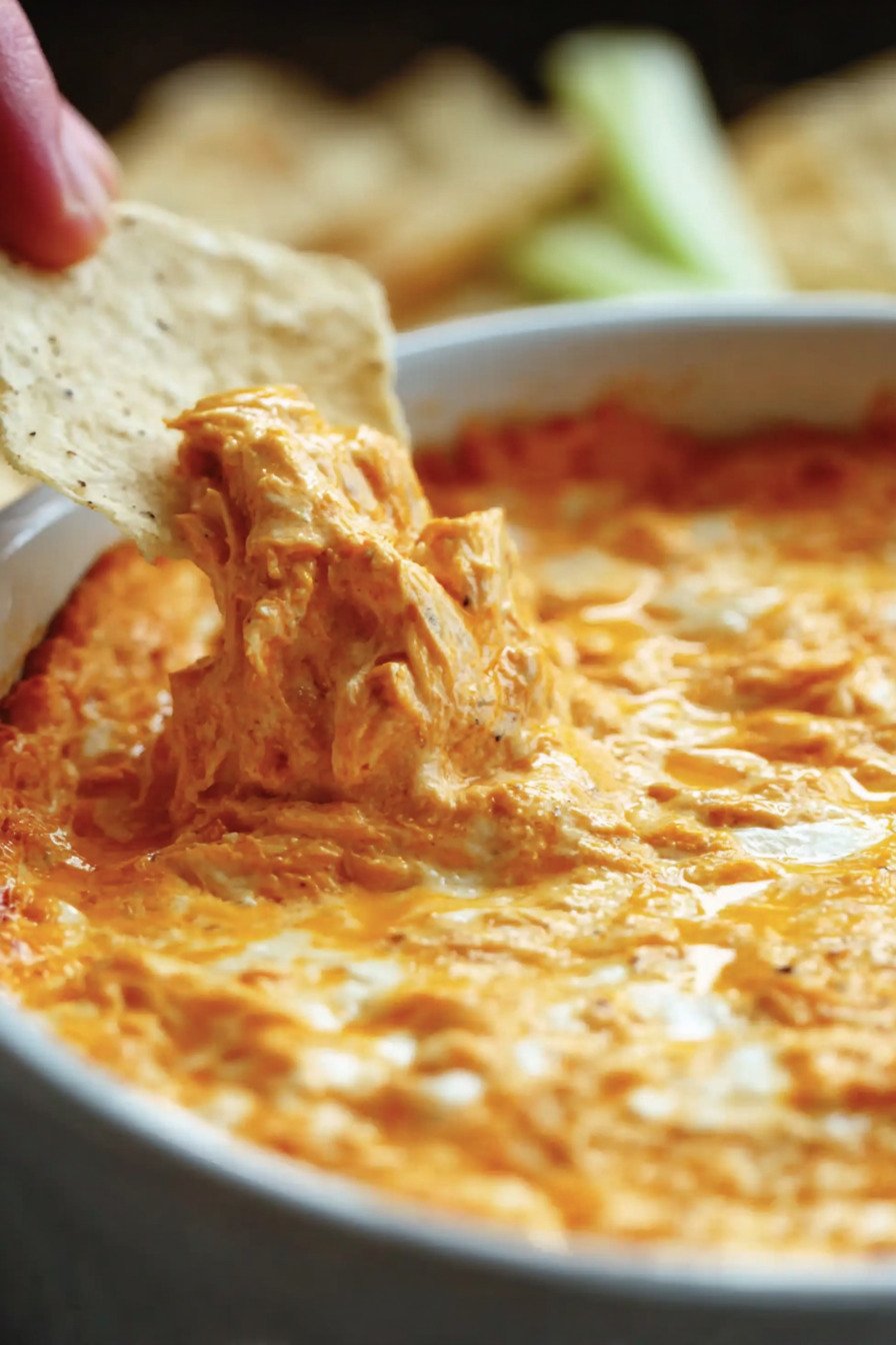 For a creamy buffalo chicken spread feel try a quick blend on half the dip then fold it back in. That trick keeps body yet gives a smooth scoop.