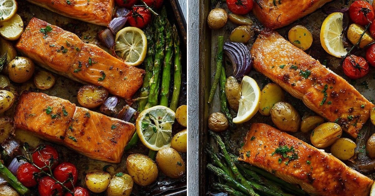 Healthy Lunch Recipes Sheet Pan Salmon and Potatoes with Veggies