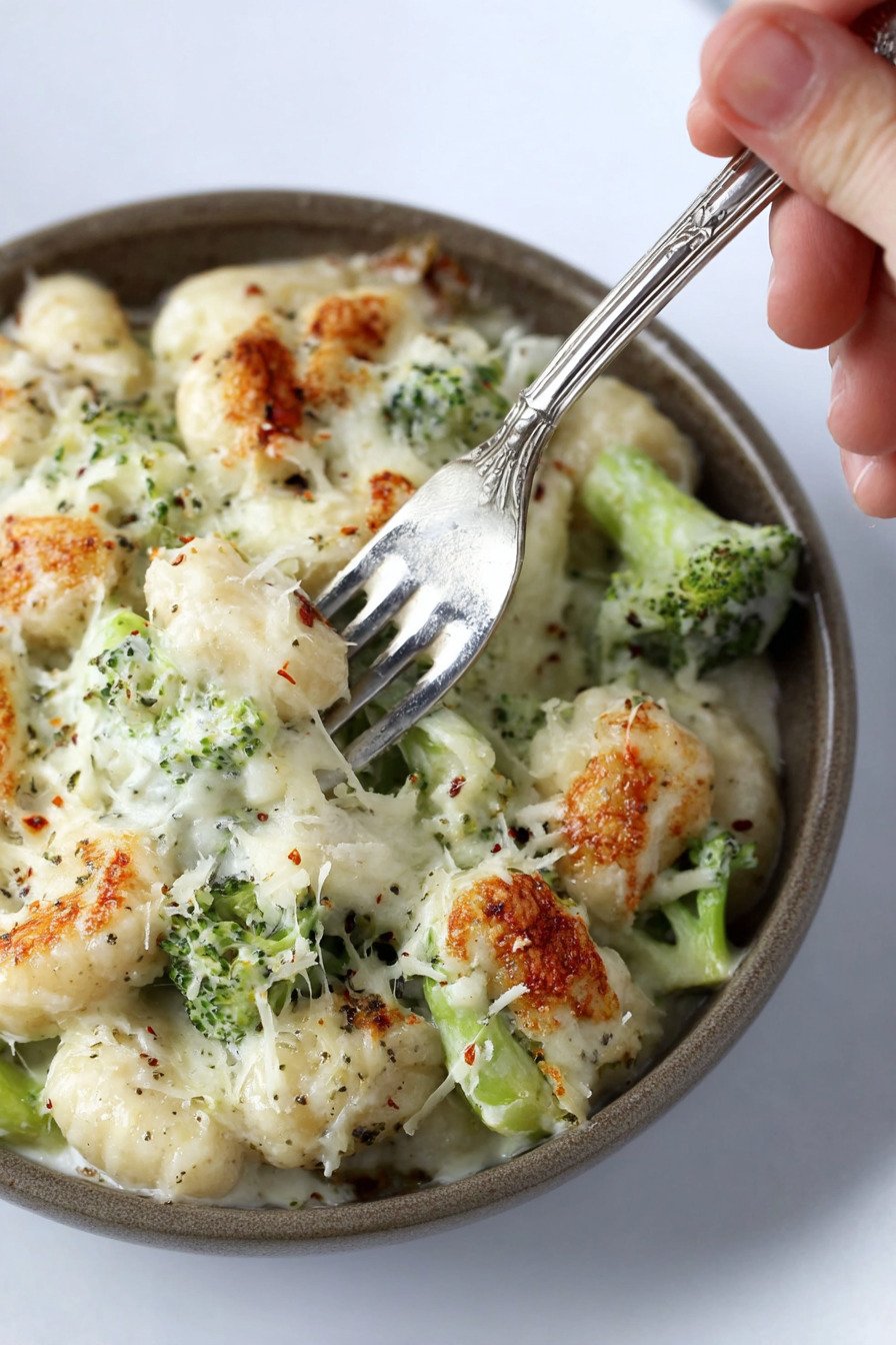 I cook this when the week feels long and the sink stays full. I grab a pan, a bag of gnocchi, and a head of broccoli. Cheese waits in the fridge. The plan stays simple and calm. This dish fits Gnocchi Recipes and lands in the cozy group of Baked Pasta Recipes. It also checks the box for Baked Dishes For Dinner. Steam rolls up when the pan hits the oven. Broccoli turns bright and tender. Gnocchi turns pillowy and light. I fold in a quick sauce that tastes like home. It brings the same comfort I get from Baked Casserole Recipes. Friends say the sauce reminds them of Broccoli Soup Crockpot days. I take that as praise. On cold nights I taste notes close to Brócoli Cheddar Soup and I do not mind one bit. We eat it hot at the table. The top pulls into long strings. The edges stay golden and a little crisp. Leftovers reheat well for lunch. If you need a sure thing for busy nights, try this Cheesy Baked Gnocchi. Warm, simple, and friendly. That is all we need.