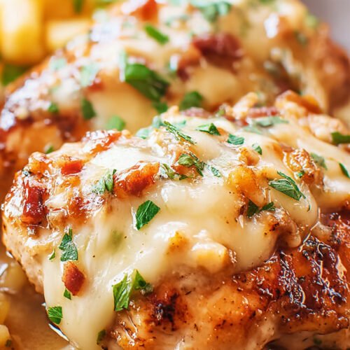 This dish makes ordinary chicken feel special. The chicken gets cooked until golden, then covered with onions, mushrooms, and melted cheese. The flavor feels like comfort food straight from a restaurant, yet it’s easy to prepare at home.