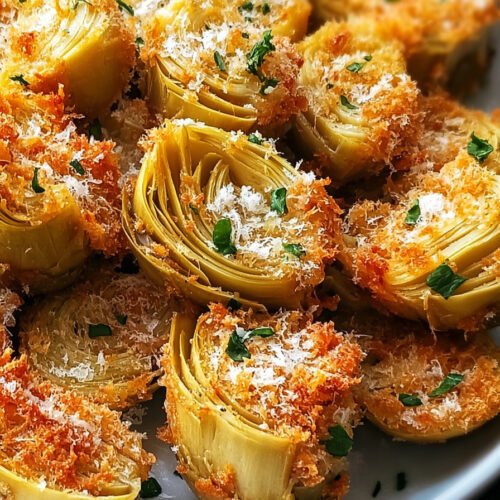 We coat artichoke hearts with parmesan and crumbs. Heat kisses the edges. The inside stays tender. Each bite feels crisp then creamy.