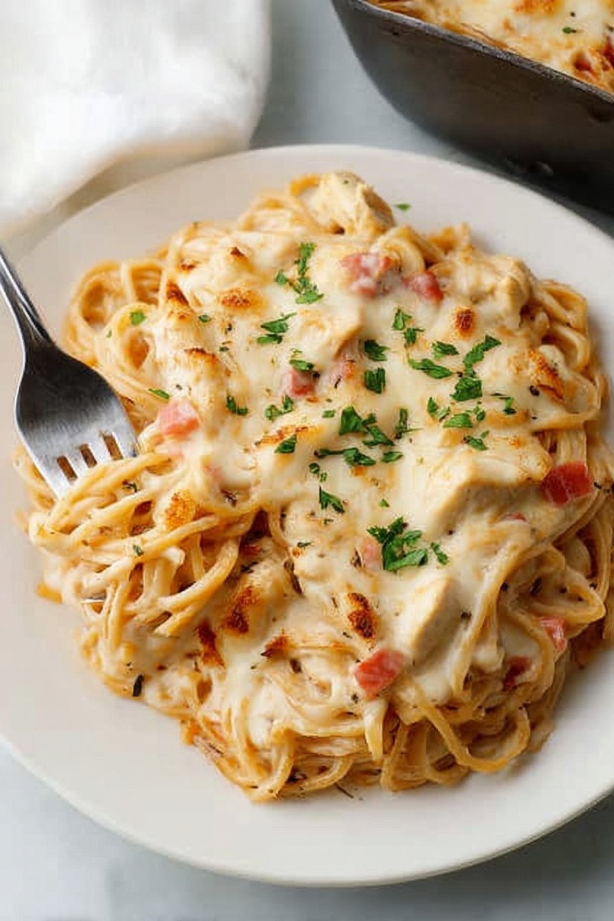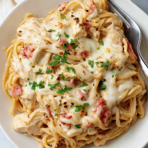 Store the pasta and sauce in separate containers if you plan to serve more than once. Mix and heat only what you need. This keeps the noodle from soaking up too much sauce on day one. Think make ahead creamy chicken spaghetti that still tastes fresh.