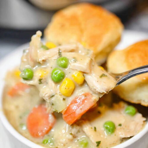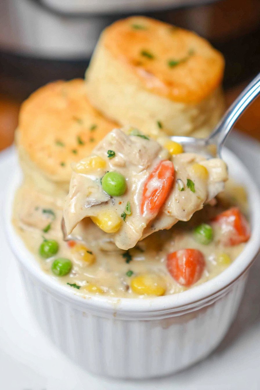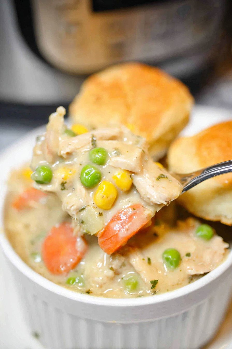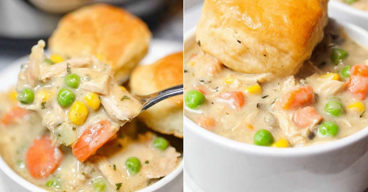 I like easy crockpot recipes with few ingredients since they help busy cooks breathe a bit. I toss chicken and vegetables in the pot. I stir a creamy base. Hours later we get a thick warm filling that tastes like the chicken pot pie my family loved when I was young. The biscuits on top bring that baked chicken comfort we all want after a long day.