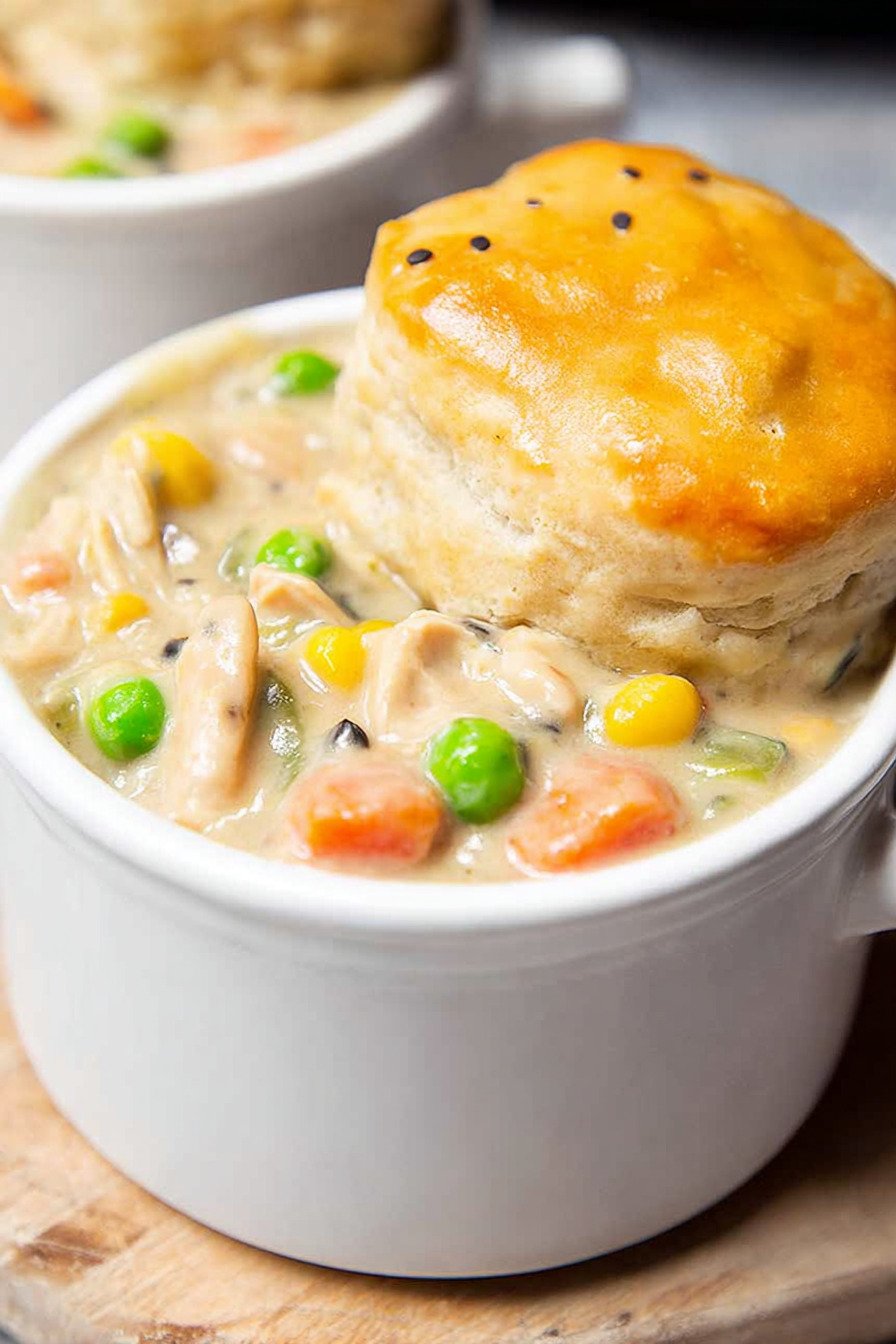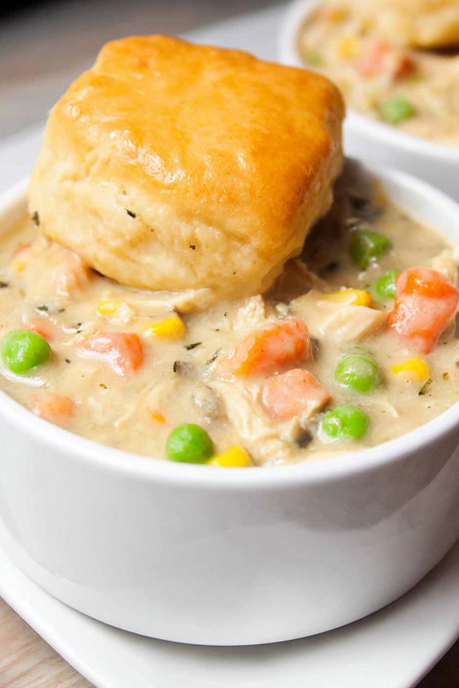 - Serve the creamy chicken mixture in bowls with warm biscuits on top.