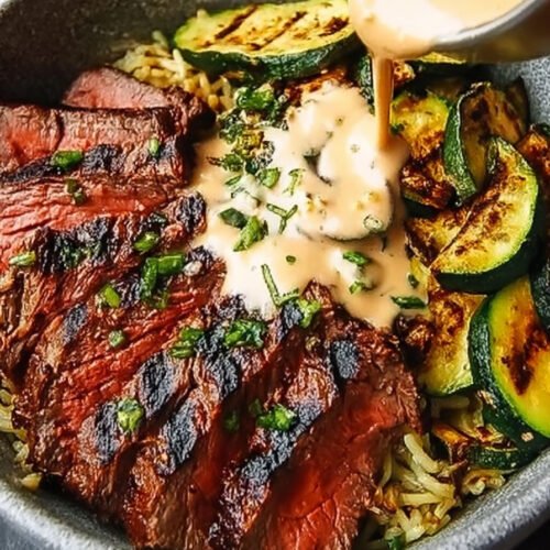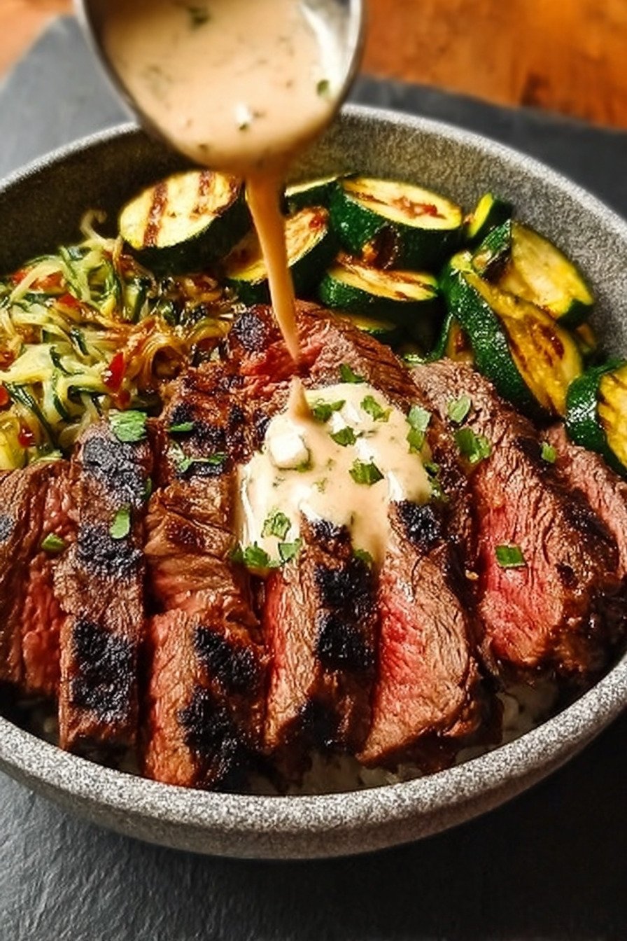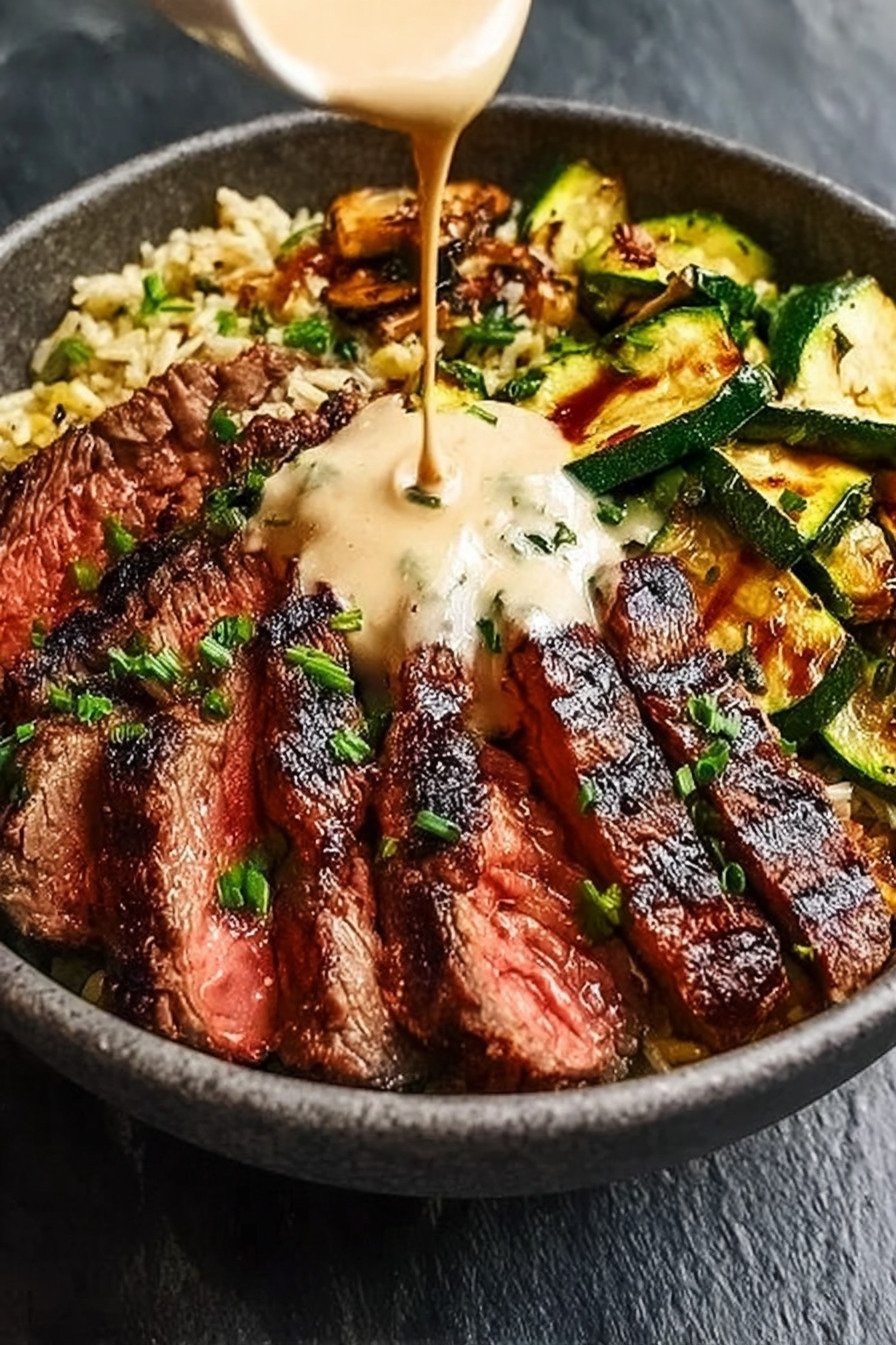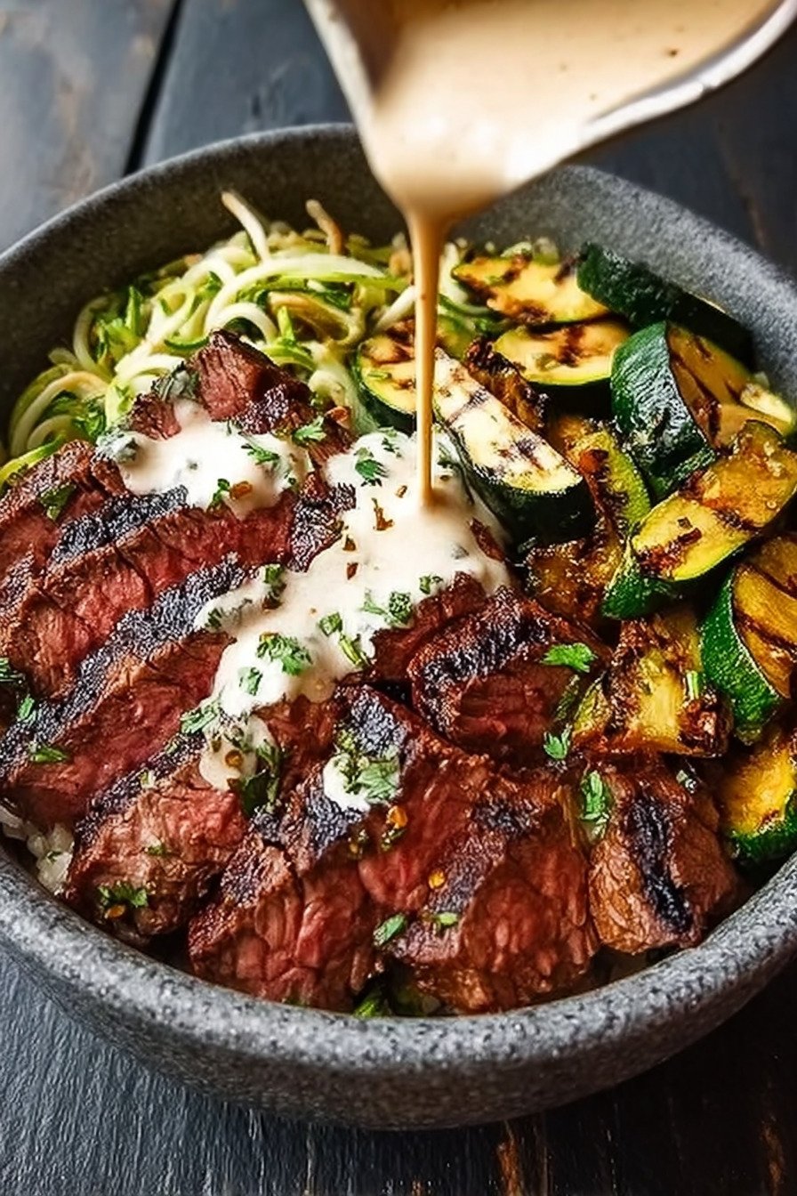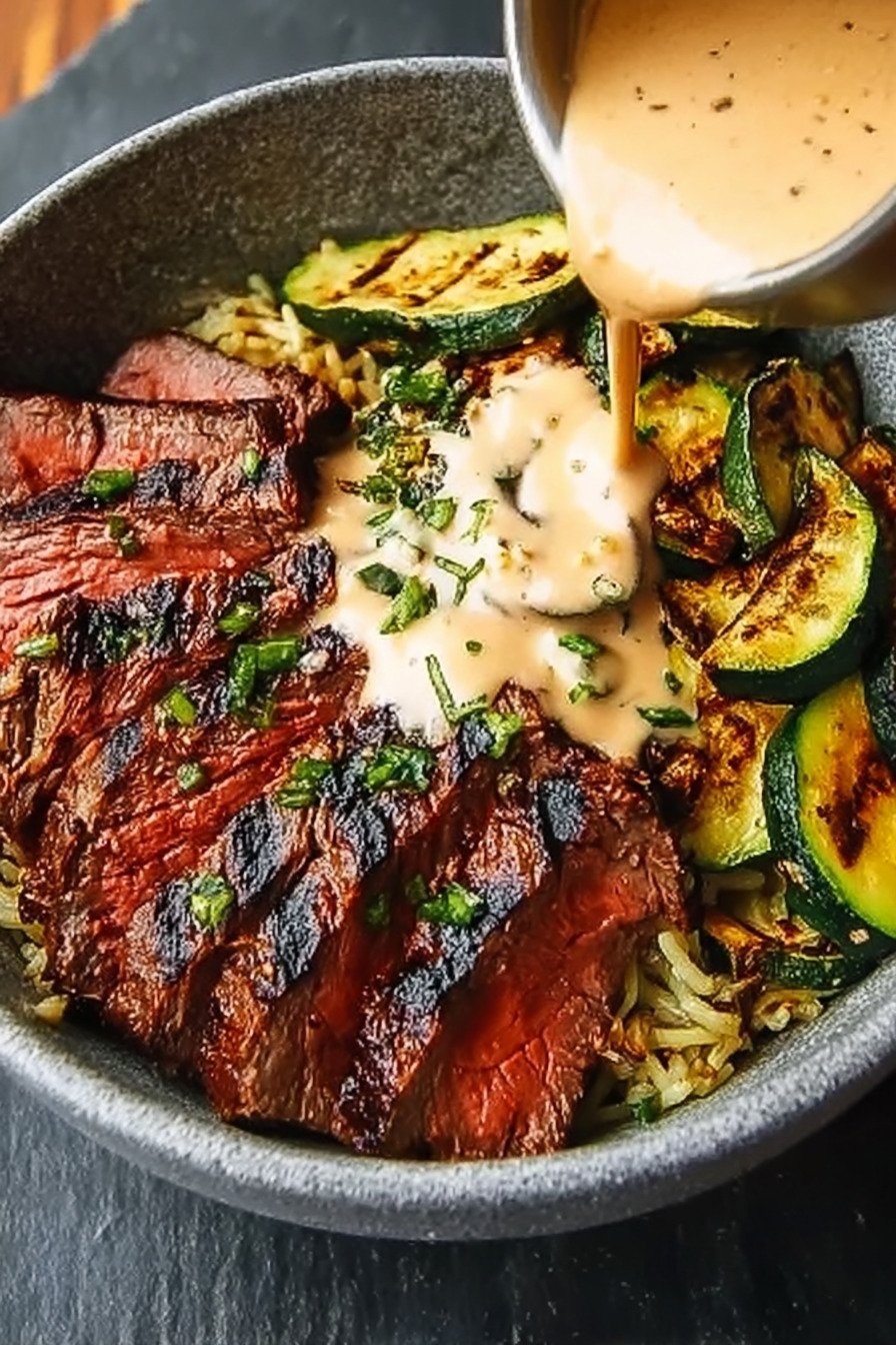 This bowl brings together tender steak, charred zucchini, warm grains, and a cool creamy sauce in one balanced meal. I love how each part holds its own yet blends into the next bite. You get protein, fresh vegetables, and texture in every forkful.