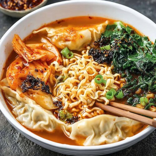 When I first made this soup, I was craving something that felt like a hug in a bowl. The warmth of the broth, the slight kick from the kimchi, and the comfort of chewy dumplings hit all the right notes. I don’t know about you, but for me, a big steaming pot of soup has this strange way of calming a busy mind. The noodles soften as they sit, soaking in the flavor, and every bite feels more grounding than the last. This dish belongs to those korean vegetarian recipes that prove you don’t need meat to feel full. The kimchi brings tangy heat, while the dumplings add that little extra heft. It’s the kind of soup you make when you want something hearty but not heavy. If you’ve been searching for a kimchi soup recipe that’s easy but rewarding, this might be the one you’ll come back to again and again. I love that it gives me a chance to use up that jar of kimchi sitting in the fridge. Whether you’re trying a korean kimchi recipe for the first time or already obsessed with recipes with kimchi, you’ll find joy here. It’s similar to a kimchi stew recipe, only lighter, and it works with both a fresh kimchi recipe or an easy kimchi recipe if you’ve made a quick batch. The broth soaks into the noodles and the dumplings float happily, waiting for you to scoop them up. It’s not fancy food, but it’s food that makes you sigh in relief after a long day.