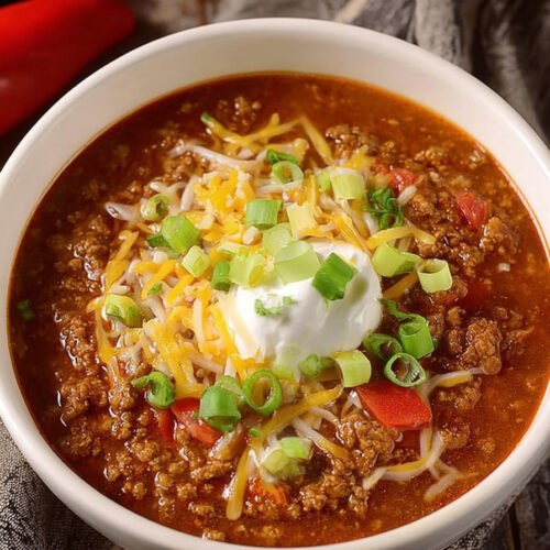 I make this chili when the house fills with friends and the game plays in the back. The pot simmers. The air smells like warm spice and tomato. I stir, taste, and nod. It feels easy. It feels right. We skip beans and keep the bowl light. The broth stays rich. The meat browns well. A little cocoa adds depth. A splash of cider adds lift. Each spoonful lands clean. You get comfort without the heavy crash. I go back for one more scoop. Then maybe two. You can cook this on a slow afternoon. You can make it tonight. You can serve it now or reheat it later. It packs well for lunch. It waits in the fridge and tastes even better the next day. Grab a ladle. Call the team. Dinner is ready.