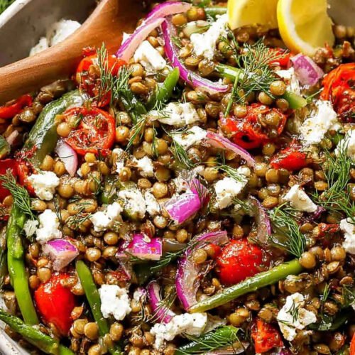 Step 5. Toss everything together in a big bowl. Add the lentils, veggies, and dressing. Give it a gentle mix so you don’t crush the lentils. Sprinkle feta over the top, and there it is—your new favorite Vegetarian Salad Recipe.