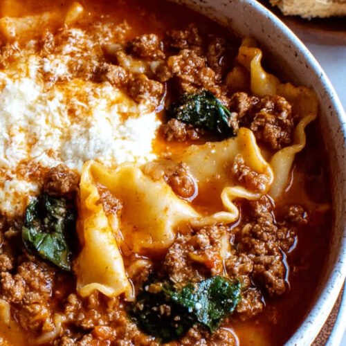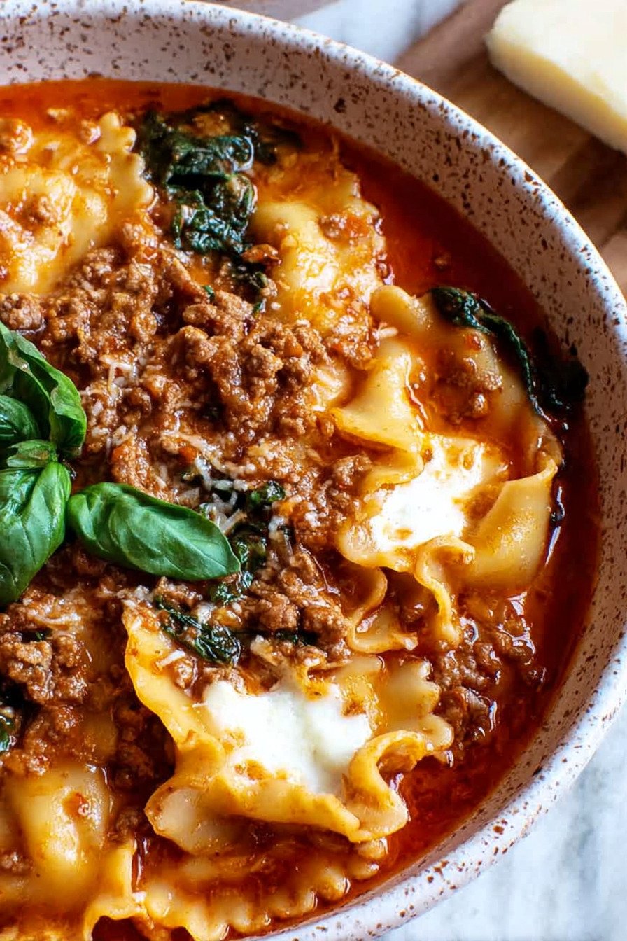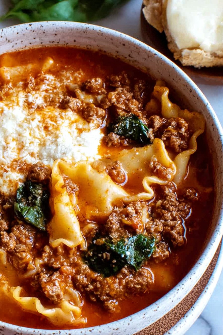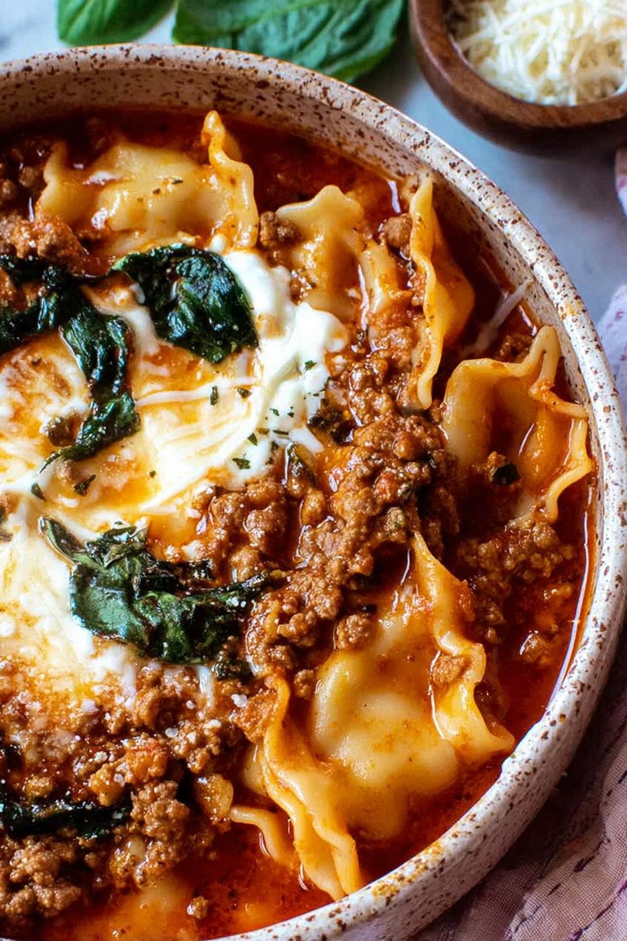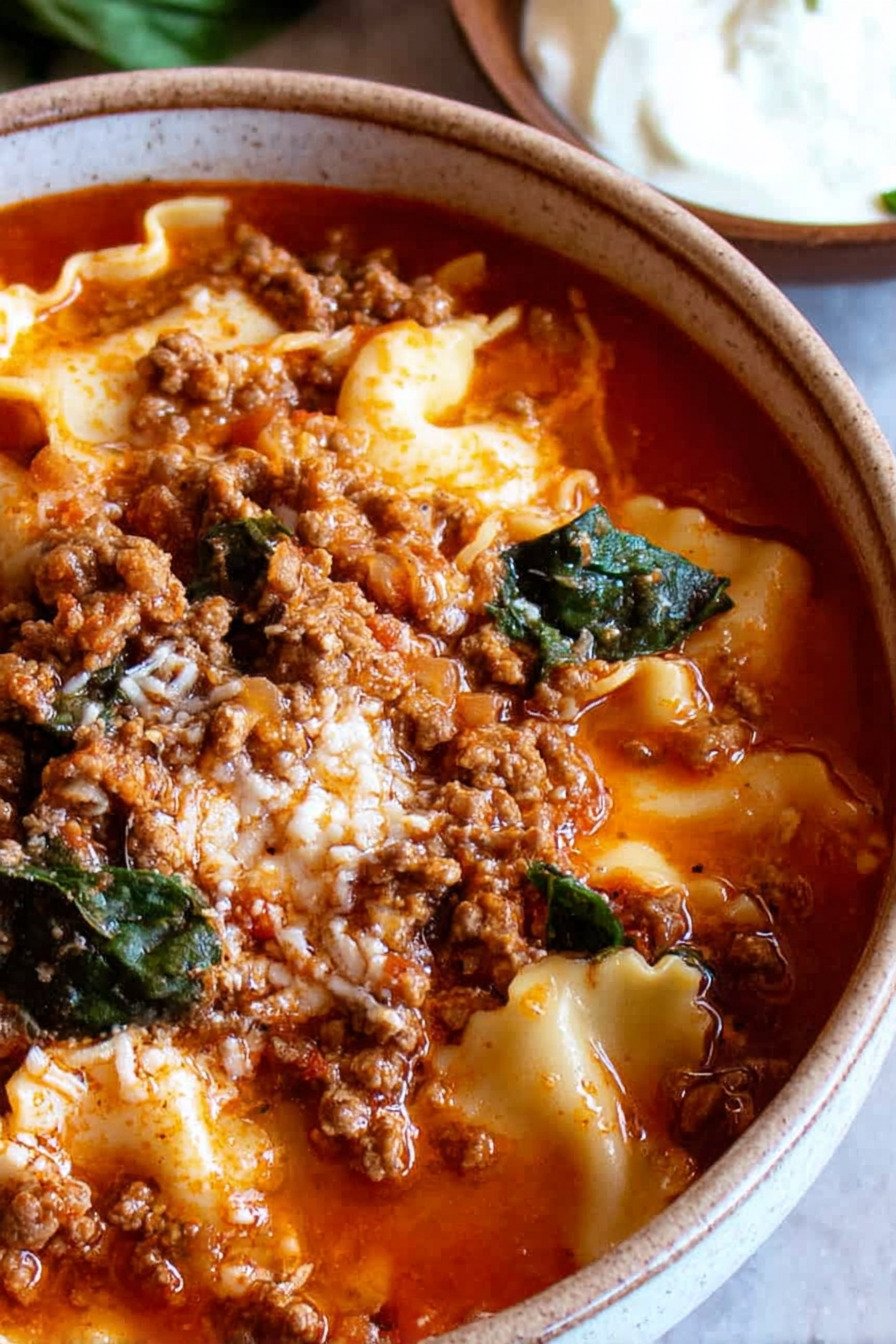 Ground Beef or Turkey The base of the soup begins with browned meat. It gives the broth depth and a savory smell that feels close to classic lasagna. Turkey works well for a lighter bowl.