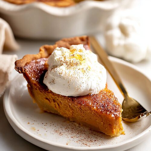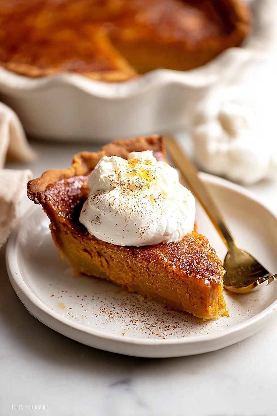 One twelfth of the pie offers about three hundred twenty calories with a balanced mix of carbs fat and protein. Sugar sits in a moderate range. Fiber shows up thanks to pumpkin. For lighter slices use half and half and a thinner sugar cap. For richer slices use full cream. I share both paths so you pick what fits your table and day.