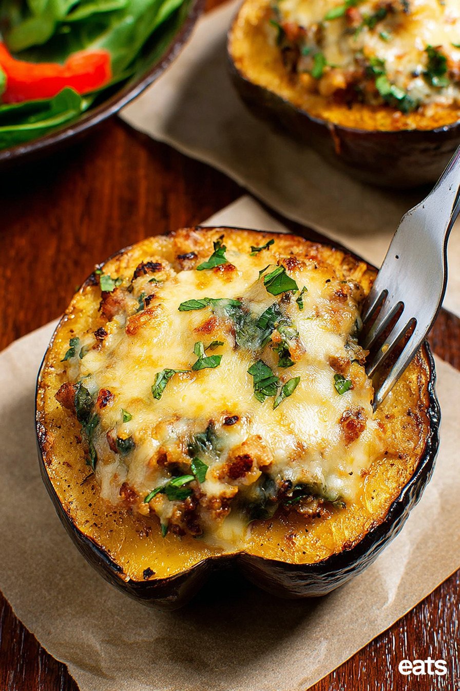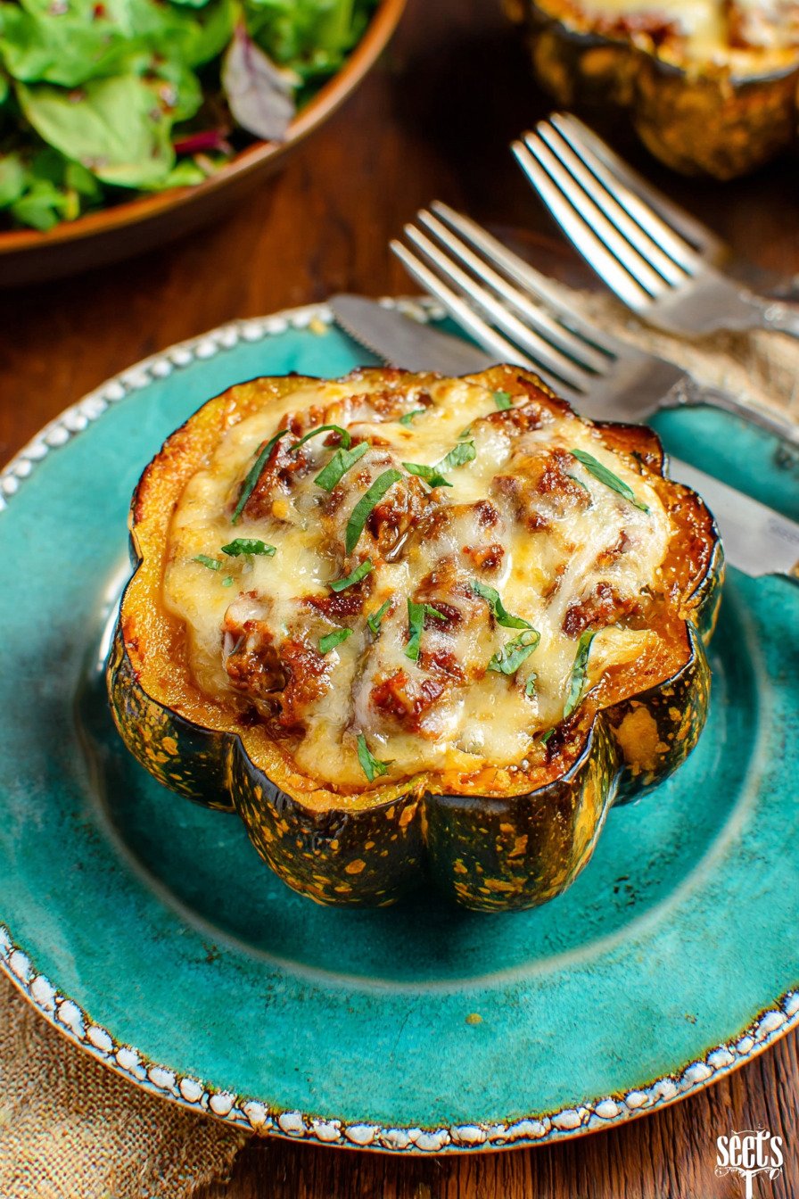 - Fill each squash half with the meat mixture. Top with mozzarella and cheddar. Return to the oven for fifteen to twenty minutes until the cheese melts and turns light golden.