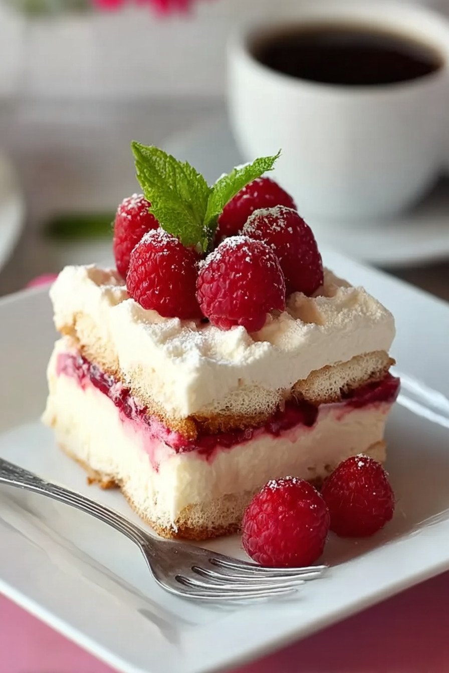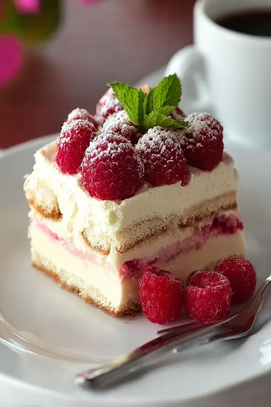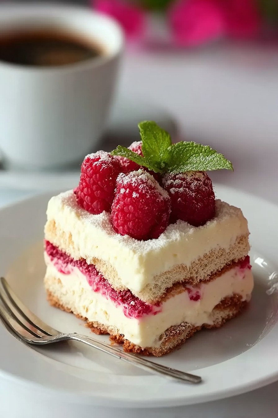 I keep nutrition notes clear and simple. A square feels rich yet balanced. Raspberries add fiber and bright flavor. Mascarpone brings fat and comfort. Cream adds body. Ladyfingers add structure. White chocolate adds sweet lift in small curls. The mix lands as a thoughtful treat you can share with ease. I pair a slice with coffee and water and call it a good finish.